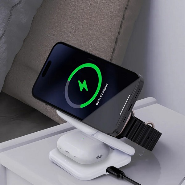 CONTACT-CHARGING – The magnetic charger securely holds the Apple Watch, iPhone, and AirPods at the ideal angle.