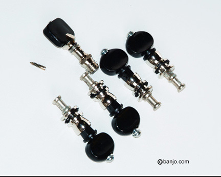 Set of 5 nickel, non-geared tuning pegs with black knob. Favorite, popular-priced patent peg for nearly three generations. Positive, non-slip action will last a lifetime.